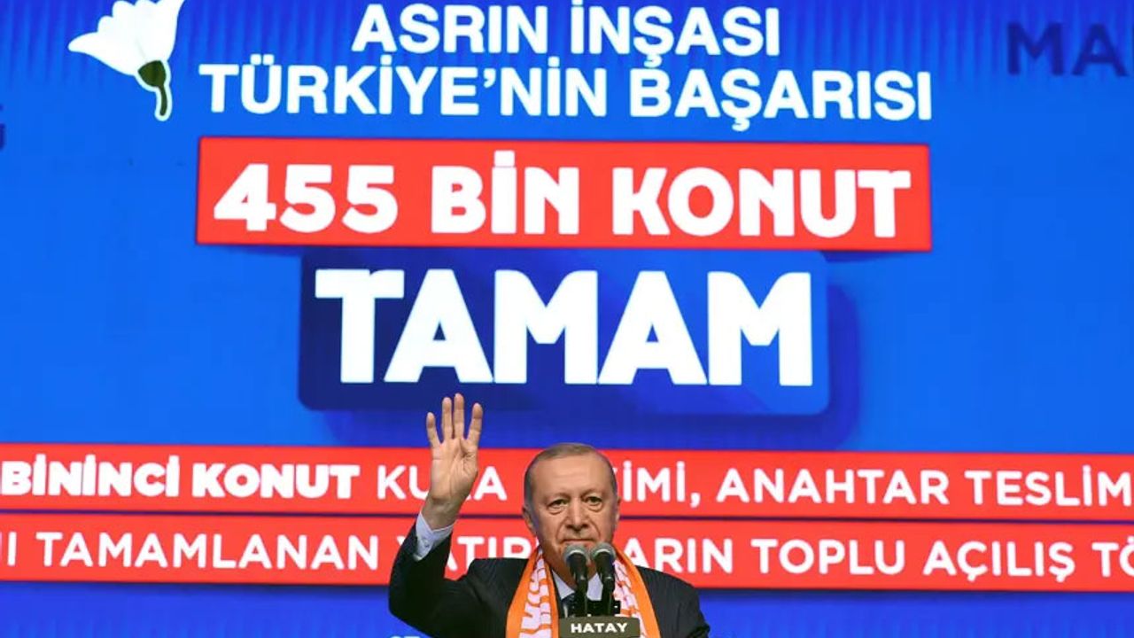 Türkiye Cumhurbaşkanı Recep Tayyip Erdoğan, Hatay'da deprem konutları teslim törenine katıldı. Cumhurbaşkanı Erdoğan, depremzedeleri asla yalnız bırakmayacaklarını belirtip "Sözlerimizi tutmanın kıvancıyla huzurunuzdayız. Deprem turistleri, iftiracılar ortada yok, biz buradayız." dedi.