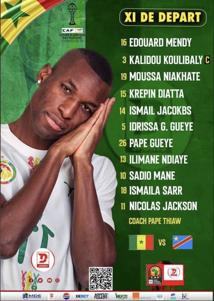 Le sélectionneur Pape Thiaw a dévoilé son onze de départ ambitieux et spectaculaire pour le choc face à la République Démocratique du Congo. Avec Édouard Mendy en dernier rempart et un axe défensif solide mené par le capitaine Kalidou Koulibaly, les Lions affichent une base rassurante. Le milieu, articulé autour d’Idrissa Gana Gueye et Pape Gueye, promet intensité et maîtrise, tandis que l’attaque fait rêver avec Sadio Mané, Ismaïla Sarr et Nicolas Jackson, prêts à faire parler leur vitesse et leur talent. www.dakaractu.com