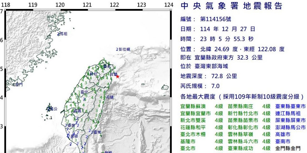 Iσχυρός σεισμός έλαβε χώρα στην Ταϊβάν. Ο σεισμός που φέρεται να έγινε αντιληπτός και στην πρωτεύουσα της χώρας, Ταϊπέι, ήταν μεγέθους 7 ρίχτερ. Σεισμός στην Ταϊβάν O Σεισμός μεγέθους 7.0 ρίχτερ έπληξε την ανατολική ακτή της Ταϊβάν στις 11:05 μ.μ. απόψε, τοπική ώρα. Το επίκεντρο βρισκόταν 32,3 χιλιόμετρα ανατολικά της κομητείας Yilan, με μέγιστη ένταση 4. Σύμφωνα με στοιχεία της Κεντρικής Μετεωρολογικής Υπηρεσίας, ο σεισμός είχε μέγεθος 7,0 Ρίχτερ και βάθος 72,8 χιλιόμετρα. Διαβάστε περισσότερα στο iefimerida.gr