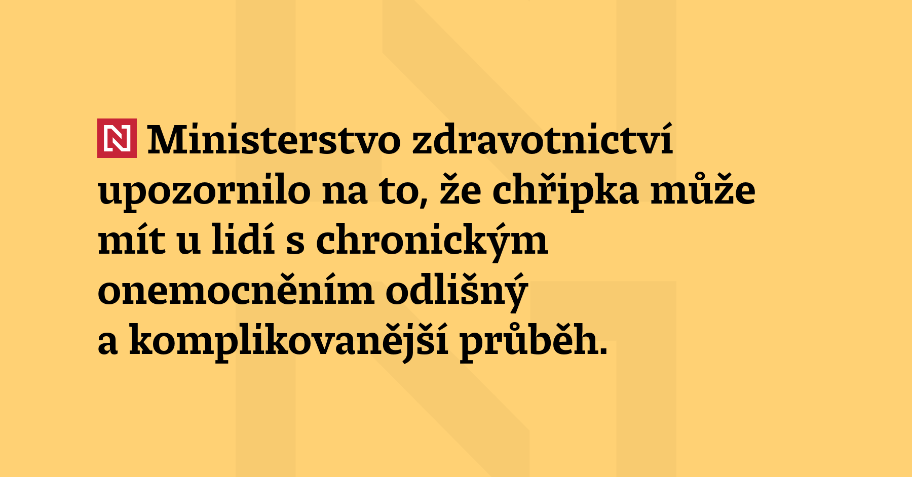 Ministerstvo zdravotnictví upozornilo na to, že chřipka může mít u lidí s chronickým onemocněním odlišný a komplikovanější průběh. U dětí se prý objevují častěji komplikace jako zánět středního ucha nebo vedlejších nosních dutin. V těžších případech lze nasadit antivirovou léčbu, antibiotika ale na chřipku nefungují. „Prevence a včasná ochrana jsou proto u rizikových skupin klíčové,“ upozornilo ministerstvo v příspěvku na síti X. (MZD)