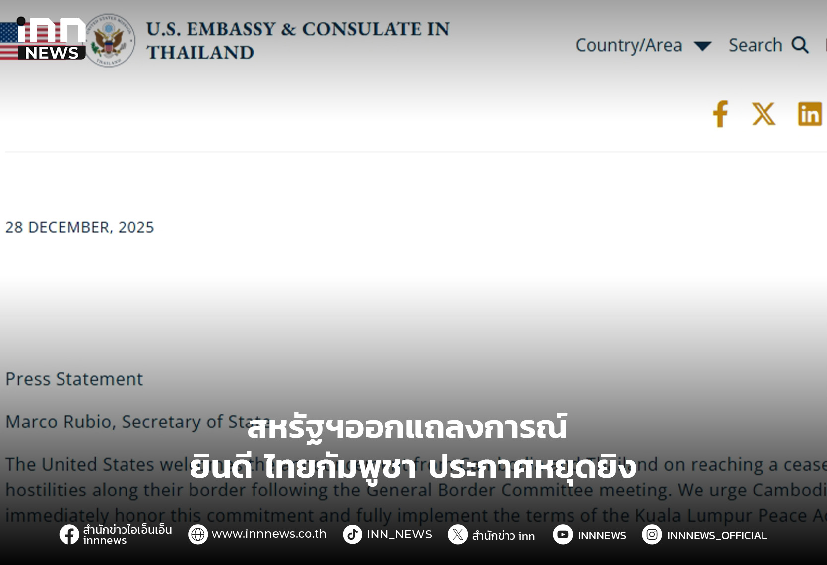 สหรัฐฯออกแถลงการณ์ ยินดี ไทยกัมพูชา ประกาศหยุดยิง เรียกร้อง 2 ฝ่ายปฏิบัติตามข้อผูกพันนี้โดยทันที และปฏิบัติตามเงื่อนไข อย่างครบถ้วน