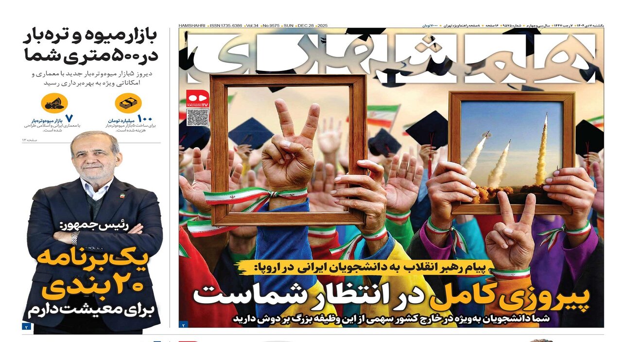 تازه ترین شماره روزنامه همشهری امروز یکشنبه ۷ دی ۱۴۰۴ با مطالب و گزارش هایی درباره مهمترین مسائل روز ایران و جهان منتشر شد.