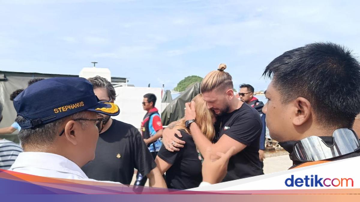 Mar Martinez Ortuno menangis di Pelabuhan Labuan Bajo setelah suami dan tiga anaknya hilang akibat kapal tenggelam. Pencarian masih berlangsung.