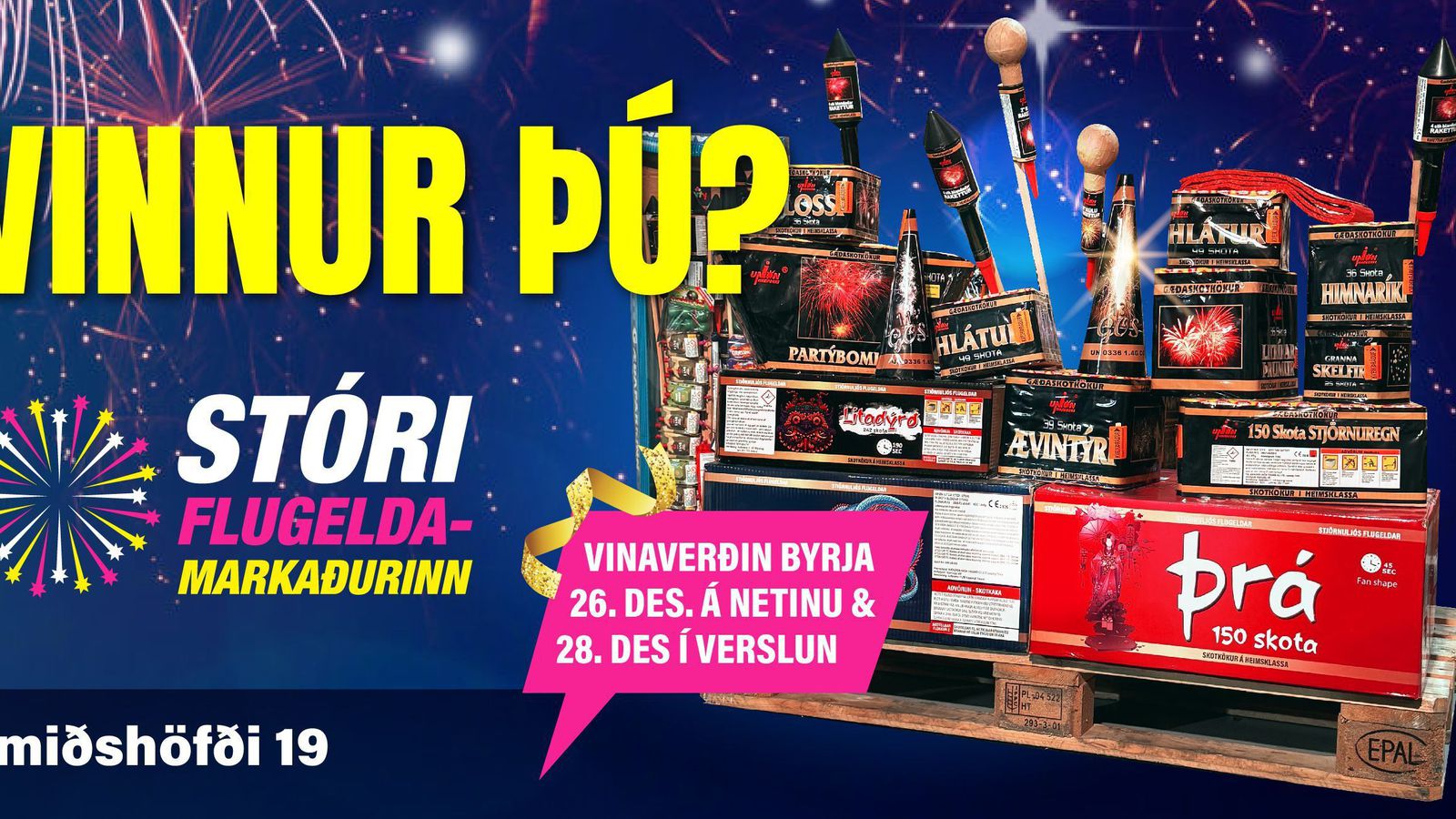 Vinadagurinn brast á með látum í Stóra flugeldamarkaðnum í dag. Hægt verður að næla sér í svakalegar sprengjur á einstöku verði allan daginn en opið verður frá klukkan 10 til 22.