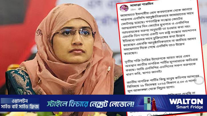 এনসিপি কিছু আসনের বিনিময়ে দলের মূল আকাঙ্ক্ষা থেকে বিচ্যুত হয়েছে বলে মন্তব্য করেছেন জাতীয় নাগরিক পার্টির (এনসিপি) জ্যেষ্ঠ যুগ্ম আহ্বায়ক সামান্তা শারমিন।