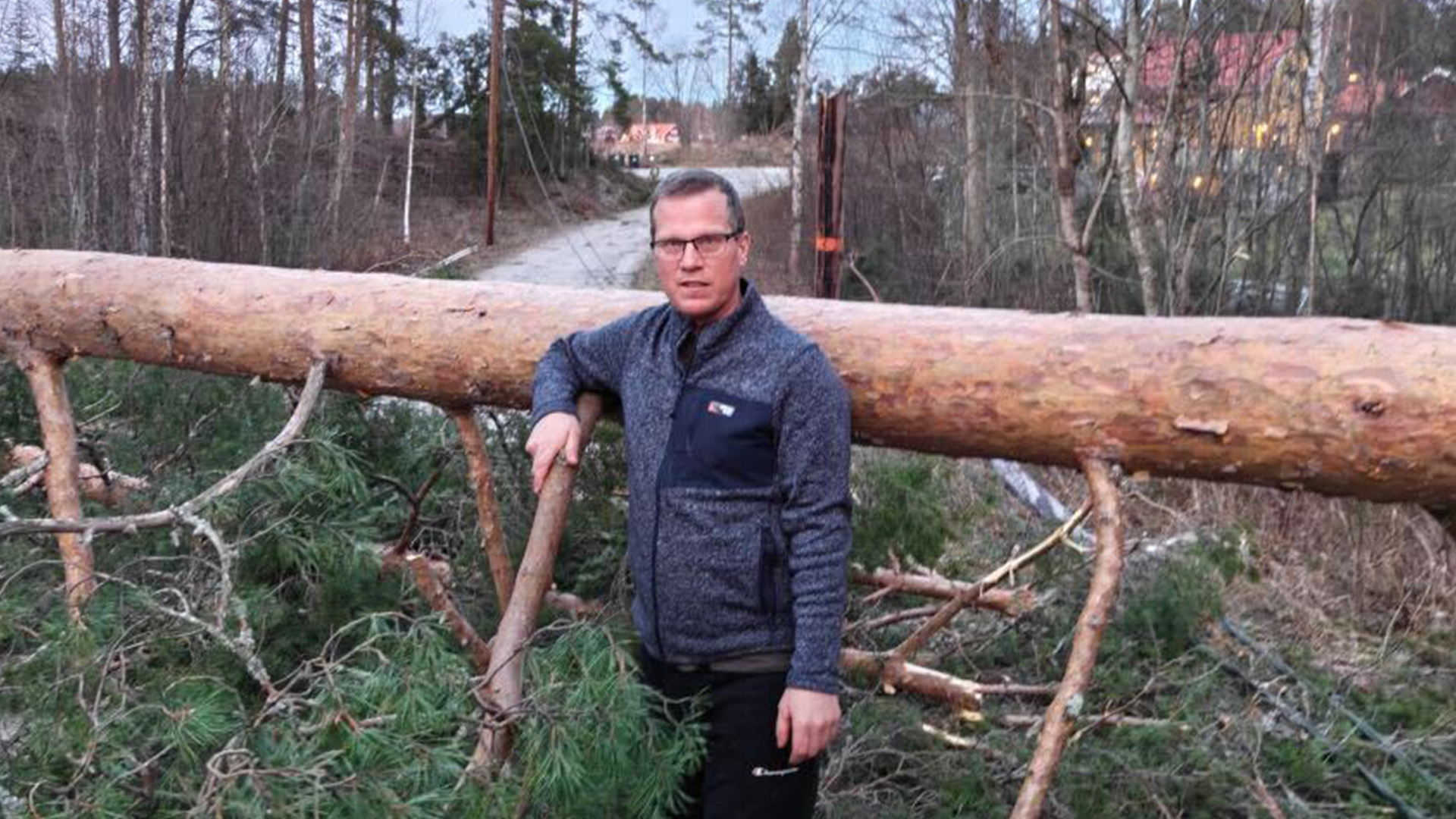 Stor förödelse, främst i form av fallna träd. Det är resultatet av stormen Johannes som svepte fram på lördagen. Hårdast drabbat är kanske Gävleborg och Västernorrland. I en by med 15 hushåll utanför Högbo i Gästrikland bor Erik Olsson. Han och hans grannar är på söndagen helt avskärmade från omvärlden, efter att träd fallit och elstolpar knäckts över vägen som förbinder byn med länsväg 272. Men till skillnad från många andra i länet har Erik och hans grannar fortfarande el. – Elledningen ligger på marken med ström i. Men stolparna har knäckts och så ligger träden kvar, så det går inte att komma fram där, säger Erik Olsson. När det blåste som hårdast på lördagen nådde vindbyarna på vissa platser i Sveriges norra halva orkanstyrka. En otäck upplevelse för Erik och familjen. – Allting dunkade och slog. Ungarna var ju livrädda. Det dundrade på rätt bra, kan man säga. Då förstod man ju att det skulle bli omfattande. ”Kors och tvärs, hit och dit” Erik är både skogsägare och biodlare. Gårdagskvällen och natten präglades av oro. – Det ligger enorma mängder med skog alldeles bakom huset då. Det har gått som en tromb liksom, så det är som stora hyggen där allting har blåst ner, säger Erik. Hur känns det att som skogsägare att se det? – Ja, man blir lite maktlös. Det är ju skog som skulle avverkas här om kanske 10, 15, 20 år. Det är bistert, men vad ska man göra? På vissa platser i skogen ligger allting som ett ”plockepinn”, menar han. Eftersom han äger 190 hektar, kan det också röra sig om skog värd stora summor pengar, som han inte vet om han kommer kunna ta rätt på. – Stammarna kan ligga två meter upp. De ligger kors och tvärs och hit och dit, säger Erik. Oklart när hjälpen kommer Eftersom strömförande elledningar fallit över vägen behöver Sandviken Energi röja de fallna träden och elstolparna. När hjälpen kommer till grannskapet vet han inte. – Man förstår väl om de prioriterar de som inte har ström. Det är ett jobb jag skulle kunna göra själv, men vi får inte för Sandviken energi eftersom det är spänning i ledningen. Har ni fått något besked om när de kan komma? – Vi hade hoppats på idag, men det verkar inte riktigt bli så, säger Erik.