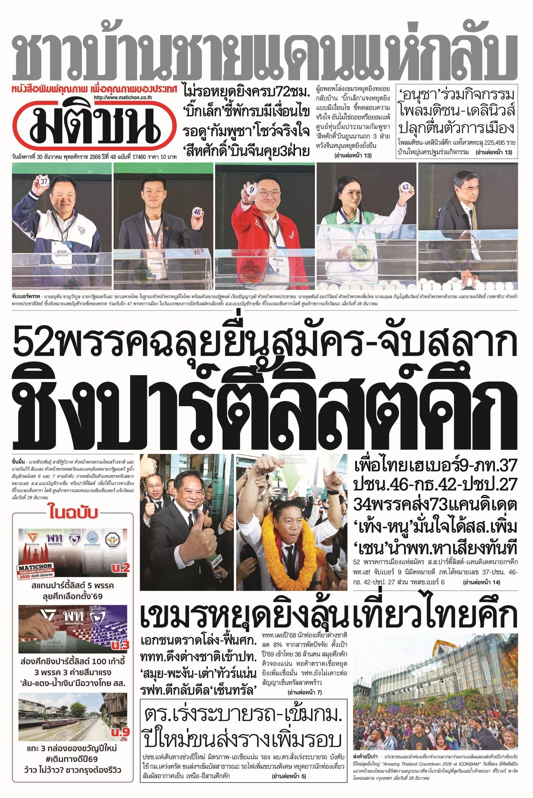 หน้า 1 หนังสือพิมพ์มติชนรายวัน ฉบับวันจันทร์ที่ 29 ธันวาคม 2568