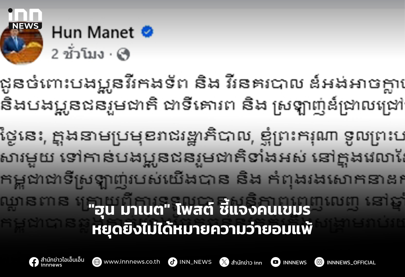 “ฮุน มาเนต” โพสต์ ชี้แจงคนเขมร หยุดยิงไม่ได้หมายความว่ากัมพูชายอมแพ้ ย้ำข้อตกลงเปิดทางให้ผู้พลัดถิ่นที่มีบ้านเรือนตามแนวชายแดน สามารถเดินทางกลับสู่บ้านเรือนของตนได้ หยุดยิงไม่เกี่ยวกับเส้นเขตแดน
