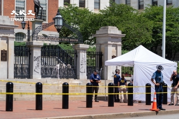 2025年全美暴力犯罪率呈下降趋势,但在一些大城市却增加。图为2025年7月23日,马塞诸塞州政府大门遭到泼漆和涂鸦后,FBI及当地执法人员在现场调查。(刘景烨/大纪元)