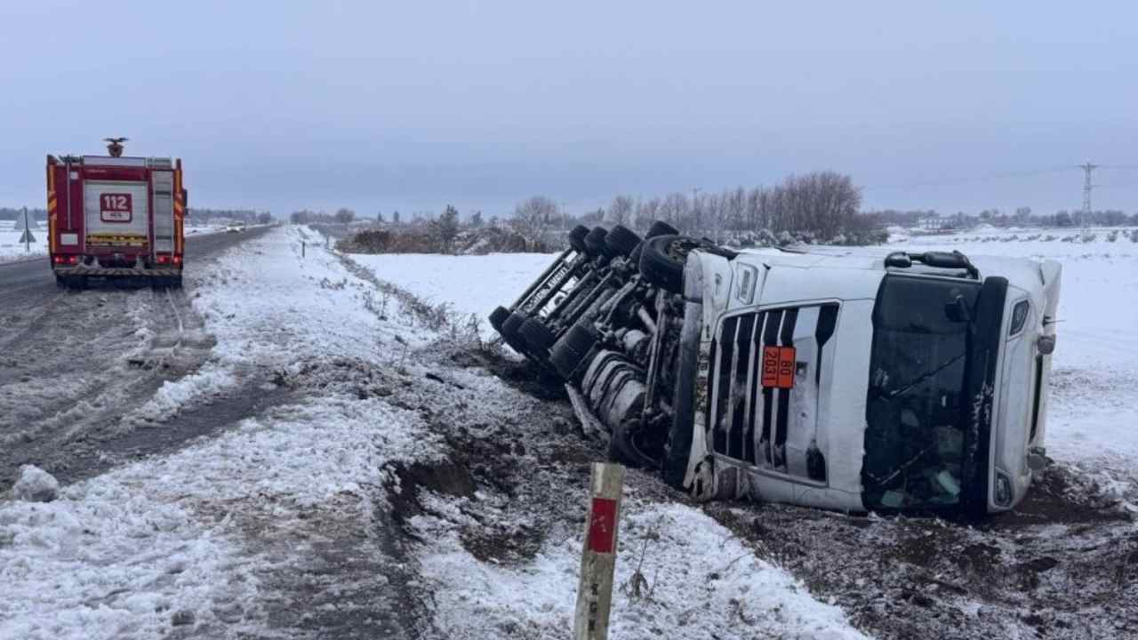 Gaziantep Şanlıurfa istikametinde kar ve buzlanma nedeniyle kontrolden çıkarak devrilen asit yüklü tankerin sürücüsü yaralandı.