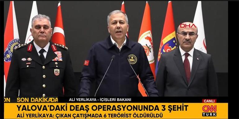 İçişleri Bakanı Ali Yerlikaya, Yalova’daki operasyonda DEAŞ’lı teröristler tarafından açılan ateş sonucu 3 polisin şehit olduğunu, 8 polis ile 1 bekçinin yaralandığını açıkladı. İçişleri Bakanı Ali Yerlikaya, Yalova’daki DEAŞ operasyonunda 6 teröristin ölü ele geçirildiğini açıkladı. Bakan Yerlikaya'ya yaptığı açıklmasında şunları kaydetti: "Son bir ay içerisinde DEAŞ terör örgütüne yönelik yürütülen operasyonlarda 137 şüpheli yakalanmış, 97 şüpheli hakkında ise adli kontrol kararı uygulanmıştır. Bu kararlılığın bir devamı olarak bu sabah 15 ilimizde 108 ayrı adrese eş zamanlı operasyon düzenlenmiştir. Bu operasyonlardan biri de bu sabah saat 02:00'de Yalova'da gerçekleşmiştir. İsmet Paşa Mahallesi Seher Sokak'ta bulunan bir adrese düzenlenen operasyon sırasında DEAŞ'lı teröristler tarafından kahraman polislerimize ateş açılmıştır. Bu hain saldırı sonucunda maalesef 3 kahraman polisimiz şehit olmuştur. Saldırıda 8 polisimiz ve bir bekçimiz de yaralanmıştır. Teröristlerin bulunduğu evde kadınlar ve çocukların olması nedeniyle operasyon büyük bir hassasiyetle yürütülmüştür. Adreste bulunan 5 kadın ve 6 çocuk sağ olarak tahliye edilmiştir. Çıkan çatışmada 6 terörist ölü olarak ele geçirilmiştir. Bu teröristler Türk vatandaşıdır. Operasyon saat 09:40'ta tamamlanmıştır" Bakan Yerlikaya sözlerini şöyle sürdürdü: "Bu topraklarda huzur ve güvenliğimizi hedef alanlar karşılarında daima cesareti ve fedakarlığıyla destan yazan güvenlik güçlerimizi bulmaktadır. Şehitlerimiz aziz milletimizin huzur ve güvenliği için canlarını ortaya koymuşlardır. Onlar görevini yaparken şehadete yürüyen kahramanlarımızdır. Şehit polislerimize Allah'tan rahmet, kederli ailelerine, emniyet teşkilatımıza ve aziz milletimize başsağlığı diliyorum. Şehitlerimizin makamları ali olsun. Tedavileri devam eden yaralı polislerimize ve bekçimize acil şifalar diliyorum."