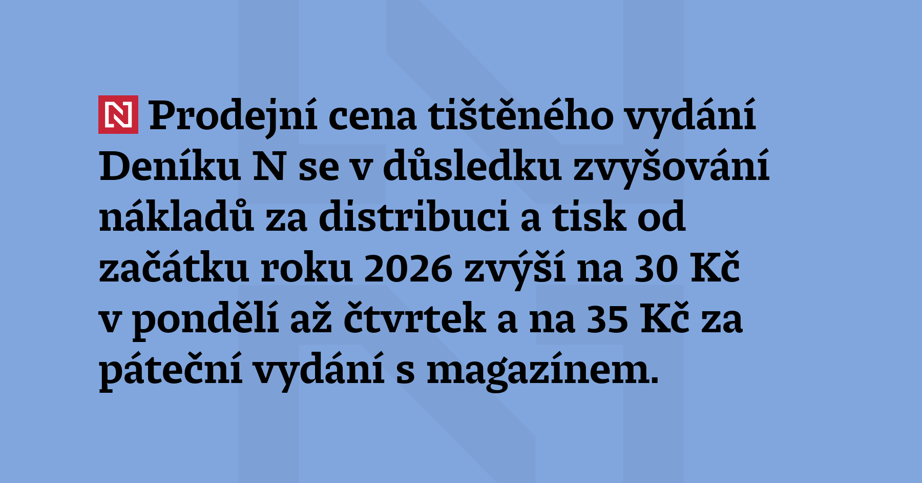 Prodejní cena tištěného vydání Deníku N se v důsledku zvyšování nákladů za distribuci a tisk od začátku roku 2026 zvýší na 30 Kč v pondělí až čtvrtek a na 35 Kč za páteční vydání s magazínem.