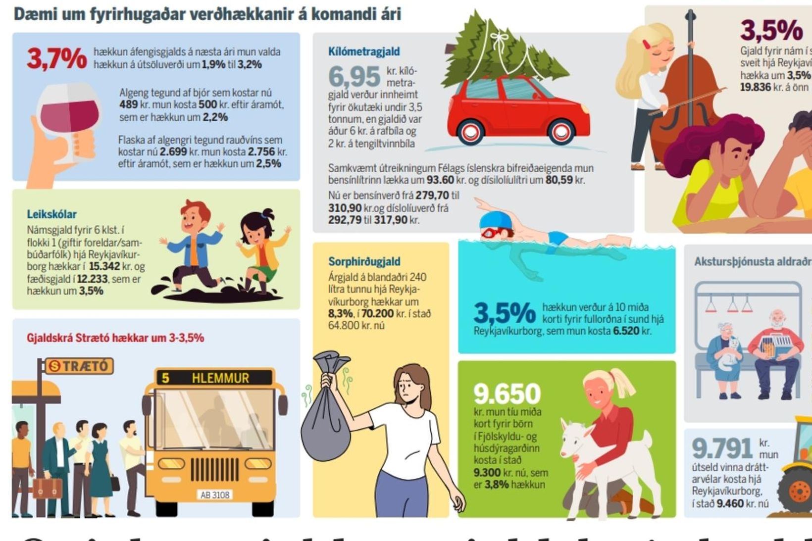 Ýmis opinber gjöld og gjaldskrár sveitarfélaga hækka að venju um áramót. Svonefndir krónutöluskattar ríkisins hækka um 3,7% í samræmi við forsendur fjárlaga og gjaldskrár Reykjavíkurborgar, stærsta sveitarfélagsins, hækka að jafnaði um 3,5% þótt finna megi bæði meiri og minni prósentuhækkun einstakra liða.