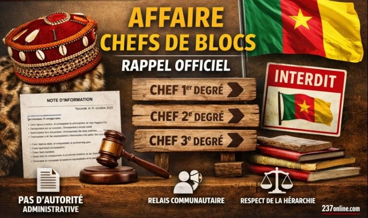 La confusion est désormais officiellement levée. À Yaoundé, une note d’information datée du 31 octobre 2025 recadre clairement le statut des chefs de blocs au Cameroun. Face aux abus constatés sur le terrain — titres usurpés, usage du drapeau national, pouvoirs autoproclamés — l’administration rappelle que ces acteurs ne sont ni des autorités traditionnelles ni […] L’article Affaire Chef de Bloc appelé Majesté : l’État recadre et fixe les limites est apparu en premier sur 237online.com .