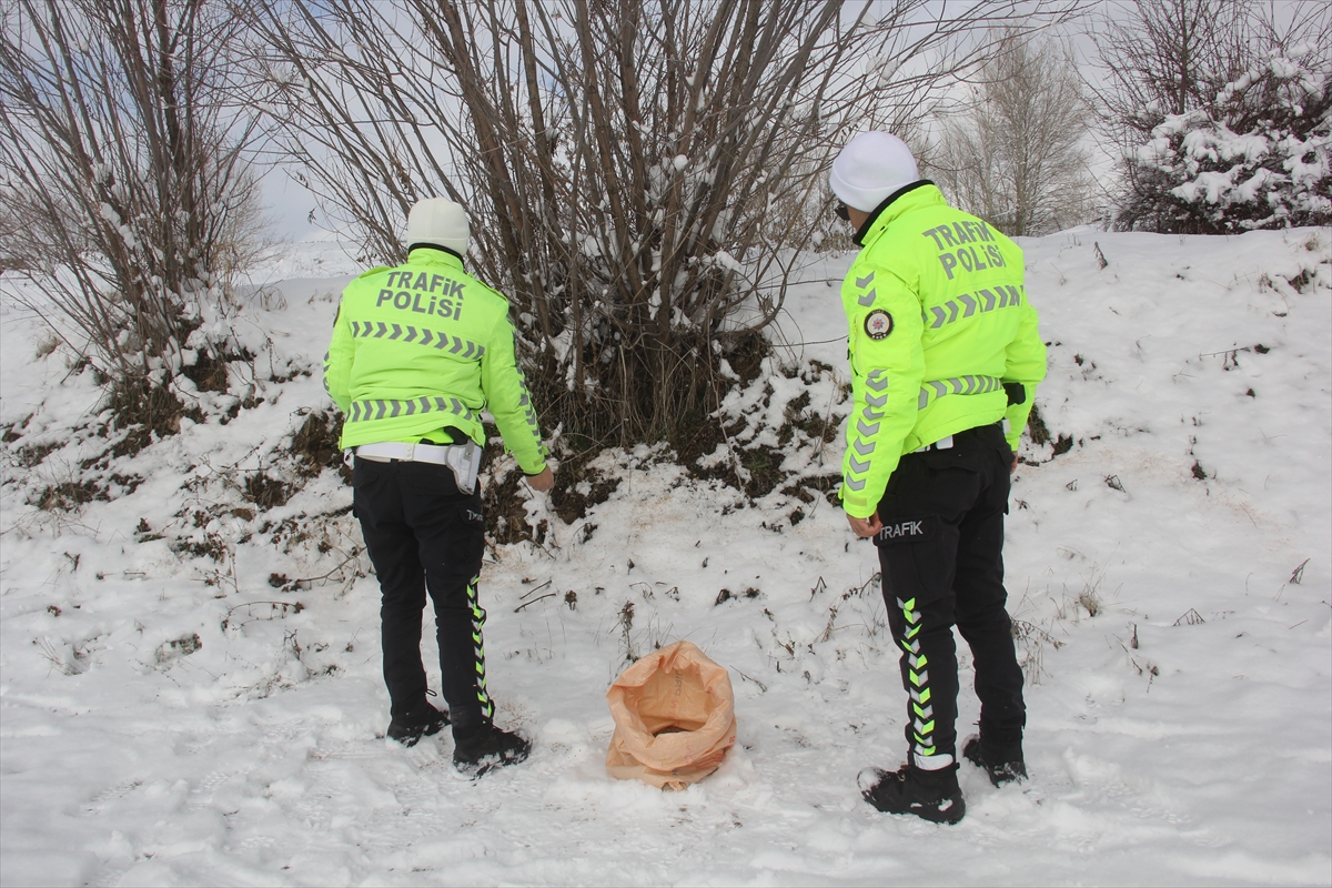 Sivas'ın Zara ilçesinde trafik polisleri, ilçede etkili olan soğuk hava ve kar yağışının ardından yaban hayvanları için doğaya yem bıraktı.