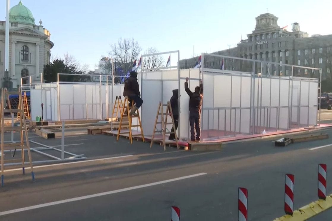 Šatorsko naselje ispred Doma Narodne skupštine u Beogradu, u kom su pristalice srpske vlasti boravile od marta, uklonjeno je tokom noći. Na tom prostoru radnici postavljaju montažne objekte uoči predstojećih praznika.