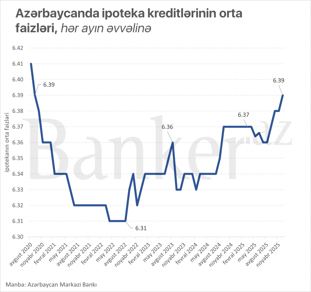Azərbaycanda ipoteka kreditlərinin orta faizləri 2020-ci ilin noyabrından bəri maksimal səviyyə olan 6.39%-ə yüksəlib. Banker.az xəbər verir ki, bu barədə Azərbaycan Mərkəzi Bankının statistik bülletenində bildirilir. İpoteka faizləri 2020-ci ilə qədər 7%-ə yaxın ərazidə olsa da, həmin tarixdən 2022-ci ilin yayına qədər sürətlə enərək 6.31%-ə düşmüşdü. 2022–2023-cü illərdə ipoteka kreditlərinin aylıq həcmləri də artan xətlə […]