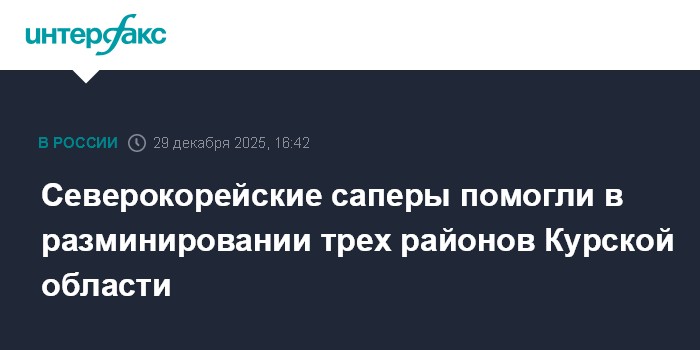 Военнослужащие КНДР оказали помощь в разминировании Суджанского, Глушковского и Кореневского районов Курской области, заявил начальник Генштаба ВС России Валерий Герасимов на совещании у президента Владимира Путина."Одновременно с решением боевых задач инженерное подразделение группировки проводит разминирование территорий Суджанского, Глушковского и Кореневского районов Курской области.