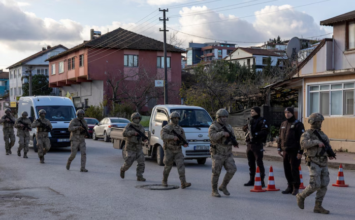 Trois policiers ont été tués lundi au cours d’une opération contre l’organisation État islamique à Yalova, dans le nord-ouest de la Turquie, a annoncé le ministre turc de l’Intérieur Ali Yerlikaya. “Ce matin, des opérations simultanées ont été menées à 108 adresses différentes dans 15 provinces. L’une d’elles a eu lieu à Yalova à 2h (minuit en Belgique) (...) Au cours de cette opération, des terroristes de l’EI ont ouvert le feu sur nos courageux policiers. À la suite de cette attaque perfide, trois de nos policiers ont malheureusement perdu la vie. Huit policiers et un agent de sécurité ont été blessés”, a affirmé le ministre. Six membres de l’organisation État islamique, tous de nationalité turque, ont été tués, tandis que cinq femmes et six enfants se trouvant à leurs côtés ont été évacués sain et saufs, a précisé M. Yerlikaya. Vague d’arrestations Jeudi dernier, le procureur d’Istanbul avait ordonné l’arrestation de 137 membres présumés de l’EI “à la suite de renseignements indiquant que l’organisation terroriste EI planifiait des attaques pendant les célébrations de Noël et du Nouvel An”. Frontière syrienne La Turquie, qui a une frontière de 900 km avec la Syrie, redoute des infiltrations de ce groupe djihadiste toujours actif chez son voisin. L’EI a notamment été dernièrement accusé d’avoir frappé des Américains à Palmyre, provoquant la mort de deux militaires et d’un interprète. Arrestation d’un chef Les services de renseignement turcs ont en outre annoncé l’arrestation, “entre Afghanistan et Pakistan”, d’un chef présumé du groupe État islamique soupçonné de préparer des attentats dans la région et jusqu’en Europe. Au moment de son arrestation, le suspect, Mehmet Gören, ramené en Turquie depuis, a été accusé par les renseignements turcs, le MIT, de “préparer des attentats-suicides contre des civils en Afghanistan, au Pakistan, en Turquie et en Europe”. 7SUR7.be www.dakaractu.com