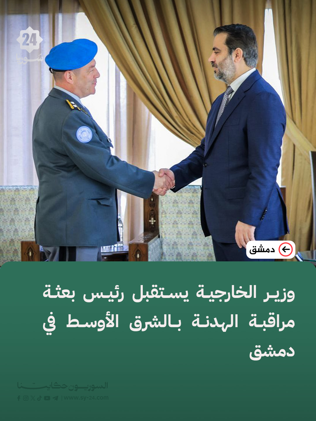 وزارة الخارجية: وزير الخارجية أسعد الشيباني يستقبل رئيس بعثة مراقبة الهدنة في الشرق الأوسط اللواء باتريك غوشات في العاصمة دمشق. اللقاء تناول دور البعثة في توثيق الانتهاكات الإسرائيلية بالجنوب السوري. جرى بحث سبل تعزيز التعاون والتنسيق القائم بين الجانبين. تم التأكيد على ضرورة دعم الاستقرار والحفاظ على الهدوء في المنطقة. The post وزير الخارجية يستقبل رئيس بعثة مراقبة الهدنة بالشرق الأوسط في دمشق appeared first on SY24 .