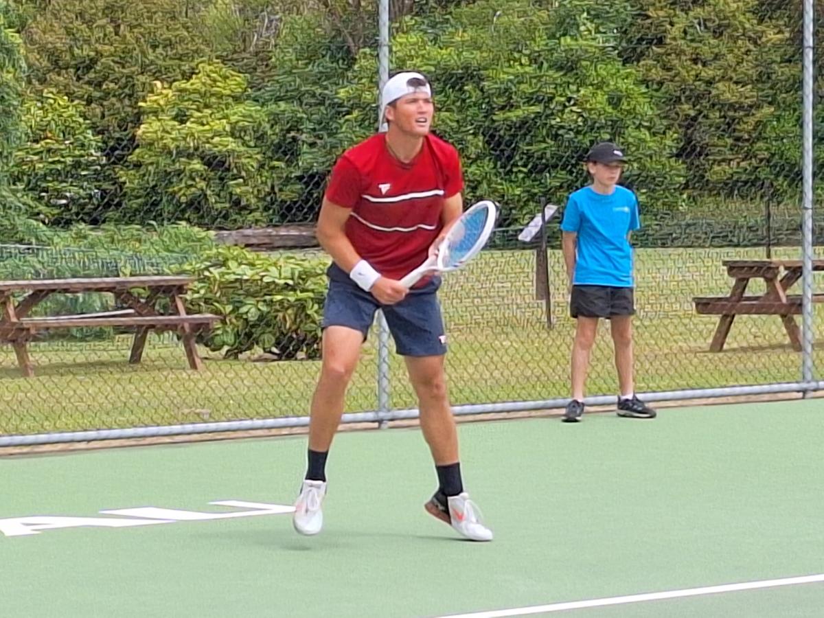 REPORT & PHOTO: NINA TAPU Queenstown’s Kai Milburn is on his toes during his three-set loss to Oliver Statham in the Te Anau Tennis Invitational yesterday.