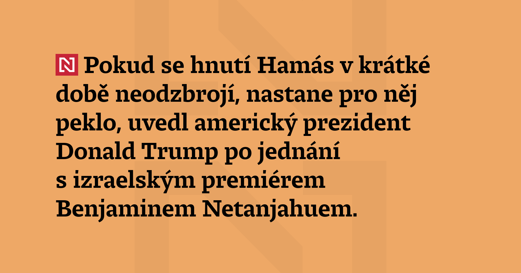 Pokud se hnutí Hamás v krátké době neodzbrojí, nastane pro něj peklo, uvedl americký prezident Donald Trump po jednání s izraelským premiérem Benjaminem Netanjahuem. (ČTK)