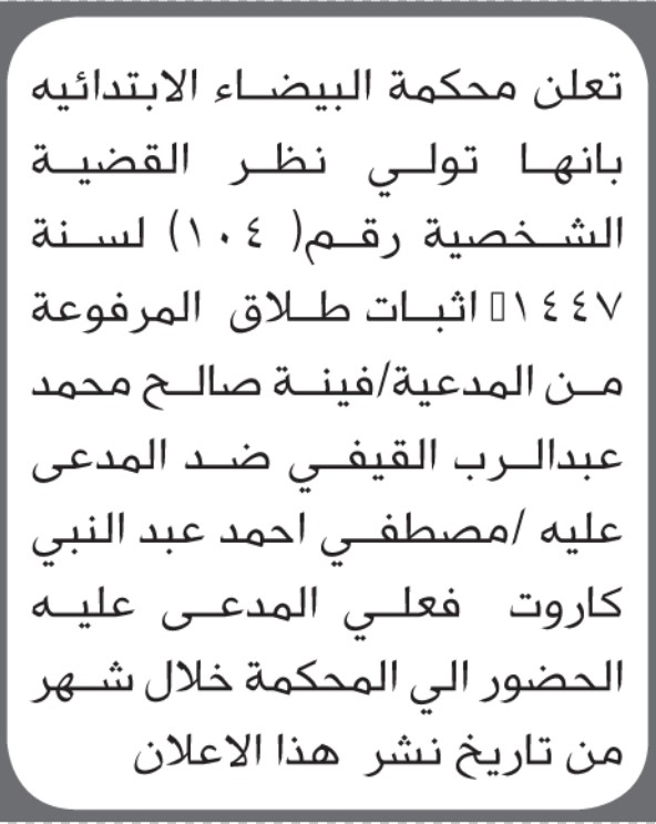 تعلن محكمة البيضاء الابتدائية بأن على/ مصطفى أحمد كاروت الحضور إلى المحكمة