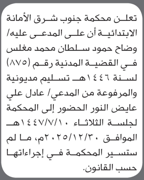 تعلن محكمة جنوب شرق الأمانة أن على المدعي عليه وضاح المغلس الحضور الى المحكمة