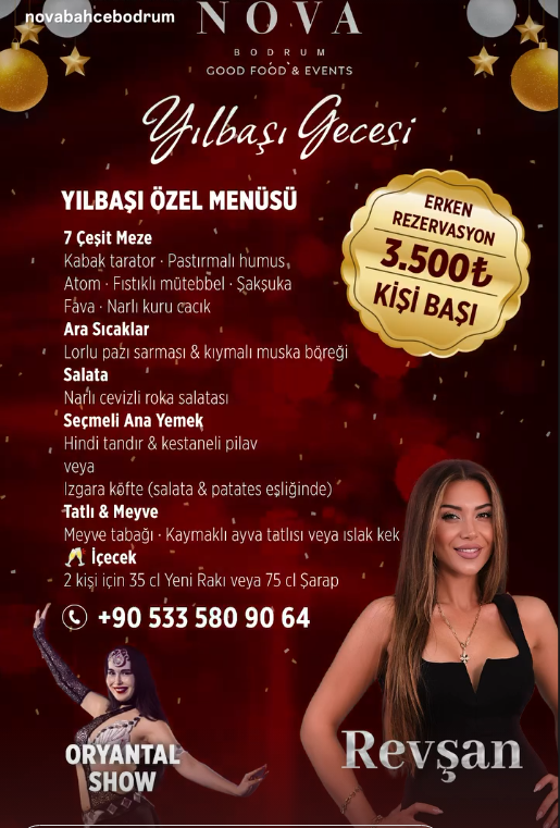 Bodrum’un sevilen mekanlarından Nova Bahçe, 2026 yılını muhteşem bir programla karşılıyor. Sanatçı Revşan’ın sahne alacağı gecede, zengin yılbaşı menüsü ve oryantal show konuklara unutulmaz bir deneyim vaat ediyor. İşte Nova Bahçe Bodrum yılbaşı programı ve menü detayları… Nova Bahçe Bodrum’da Unutulmaz Yılbaşı Gecesi (H2) Bodrum’da yeni yıl heyecanı şimdiden başladı. Nova Bodrum, 31 Aralık gecesi […] The post Bodrum’da Yılbaşı Coşkusu: Nova Bahçe’de Revşan ve Oryantal Show ile Eğlence Zirve Yapacak! first appeared on Bodrum’da Bugün .