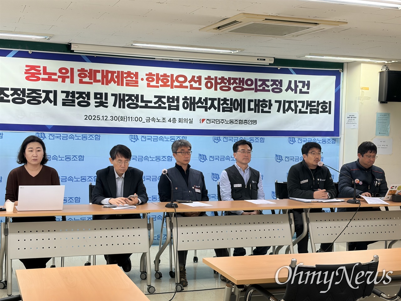 고용노동부가 최근 발표한 '노조법 해석지침'을 두고 논란이 이는 가운데 민주노총이 해당 시행령이 법 개정 취지를 무력화시키고 있다며 폐기를 촉구했다. 특히 중앙노동위원회(중노위)가 하청 노동자들이 제기한 조정 신청 사건에서 현대제철·한화오션 원청의 사용자성을 인정한 것을 언급하며 노동부 해석지침과 중노위 결정이 충돌한다고 비판했다. 민주노총은 30일 오전 11시 서울 중구 금속노조 회의실에서 '중노위 현대제철·한화오션 하청쟁의조정 사건 조정중지 결정 및 개정노조법 해석지침에 대한 기자간담회'를 열었다. 이태환 민주노총 수석부위원장은 "중노위 결정은 현대제철과 한화오션(원청)이 '진짜 사장'임을 다시 한 번 확인한 것이다. 노동부 시행령, 해석지침은 이러한 결정과도 맞지 않는다"고 비판했다. 허원 금속노조 부위원장 또한 "노동부가 말도 안 되는 시행령으로 이상한 선을 그어, 마치 그 선이 기준인 것처럼 말한다. (기존에) 노조법 개정 취지를 살려 선을 넘어 투쟁하겠다"고 밝혔다. 전체 내용보기
