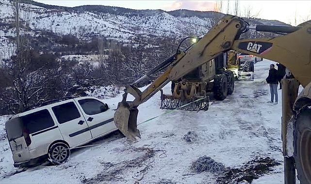 Elazığ'da etkili olan kar yağışı nedeniyle yolda mahsur kalan hafif ticari araç ekiplerin çalışmasıyla kurtarıldı.