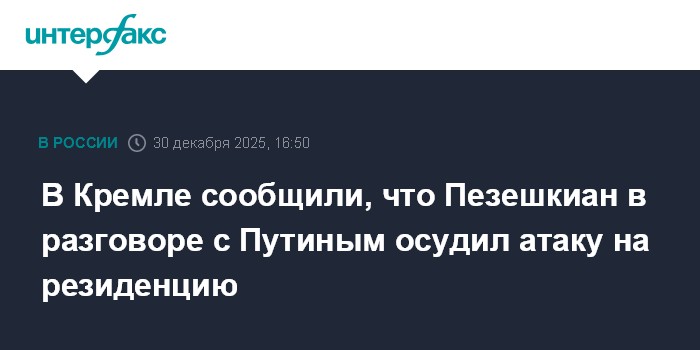 Президент Исламской Республики Иран Масуд Пезешкиан в ходе телефонного разговора с российским коллегой Владимиром Путиным осудил организованную киевским режимом масштабную атаку беспилотников на государственную резиденцию президента России в Новгородской области, сообщает пресс-служба Кремля во вторник.
