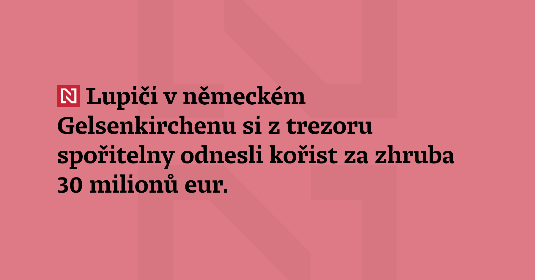 Lupiči v německém Gelsenkirchenu si z trezoru spořitelny odnesli kořist za zhruba 30 milionů eur. Podle DPA je to největší loupež v dějinách německé kriminalistiky. Lupiči se podle agenturyvloupali do 3200 bezpečnostních schránek, ve kterých mělo věci asi 2500 lidí. Před budovou jsou nyní znepokojení klienti, po spořitelně naléhavě požadují informace. (DPA, RND)