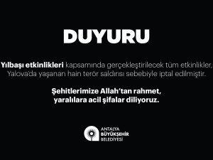 ANTALYA'DA YILBAŞI ETKİNLİKLERİ İPTAL EDİLDİ YALOVA'da DEAŞ'a yönelik operasyonda 3 polisin şehit olması sonrası Antalya Büyükşehir Belediyesi ile Konyaaltı ve Kepez belediyeleri, yılbaşı kapsamında planlanan tüm etkinlikleri iptal etti.