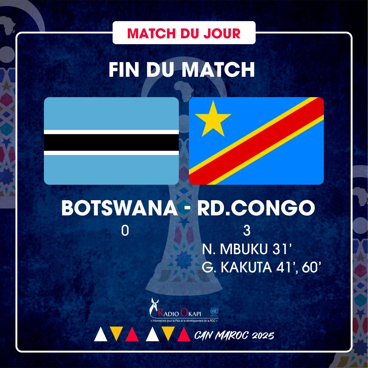La RDC a battu le Botswana ce mardi 30 décembre 2025 au Stade Moulay Abdellah de Rabat sur le score de 3-0, en match décisif comptant pour la dernière journée du Groupe D de la CAN Maroc 2025. Après quelques minutes d’hésitation, les Léopards de la RDC ont affiché leur ambition de terminer premiers de ce groupe D. En trente minutes de jeu, leur suprématie était bien visible, autant qu’ils ont accentué leur pression sur le camp averse : treize tirs congolais contre un seul pour les Botswanais.