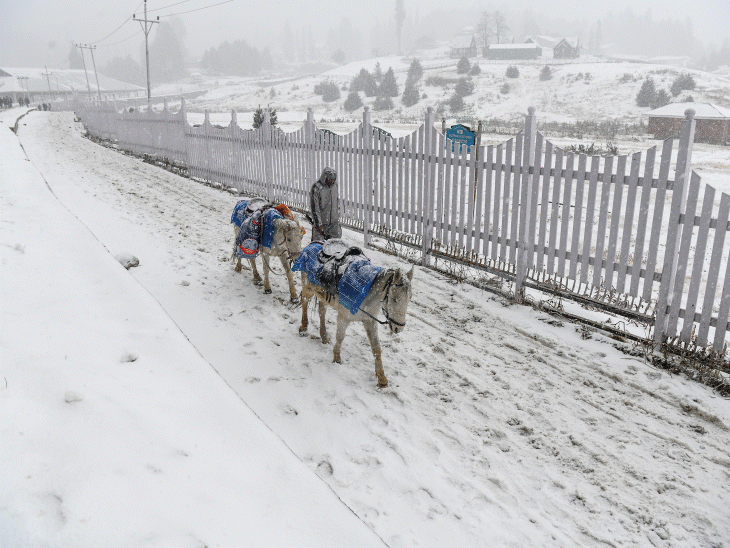 जम्मू-कश्मीर में चिल्लई कलां के बीच कश्मीर घाटी के कई इलाकों में मंगलवार को बर्फबारी हुई। गुलमर्ग में बर्फबारी के बाद बड़ी संख्या में पर्यटक पहुंचे हैं। श्रीनगर में न्यूनतम तापमान 1 डिग्री सेल्सियस दर्ज किया गया। बुधवार को भी बर्फबारी का अलर्ट है। राजस्थान में कड़ाके की सर्दी के बीच 2 दिन बारिश की भी चेतावनी है। उत्तर भारत में सक्रिय होते एक वेस्टर्न डिस्टरबेंस के कारण 31 दिसंबर को 11 जिलों में बारिश की संभावना है। इसके साथ 1 जनवरी को घने कोहरे और हल्की बारिश का अलर्ट है। यूपी में भी कड़ाके की सर्दी पड़ रही है। अभी इससे राहत मिलने वाली नहीं है, नए साल पर बारिश के आसार हैं। मंगलवार को गोरखपुर, प्रयागराज, बलिया, कानपुर समेत 37 शहर कोहरे की चपेट में रहे। दिल्ली में बुधवार को घने कोहरे का अलर्ट है। न्यूनतम 8°C और अधिकतम 23°C तापमान रहने की संभावना है। नए साल के पहले दिन 1 जनवरी को हल्की बारिश के भी आसार हैं। जम्मू-कश्मीर में बर्फबारी की 4 तस्वीरें... अगले 2 दिन के मौसम का हाल... 1 जनवरी: बारिश-बर्फबारी के आसार 2 जनवरी: पहाड़ी राज्यों में भारी बर्फबारी