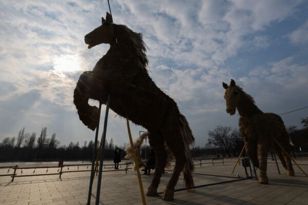 在红马之年2026年丙午年到来之前的12月28日,首尔麻浦区世界杯公园内安装了以芒草制作而成的马造型雕塑“芒草马兄弟”。(韩联社)