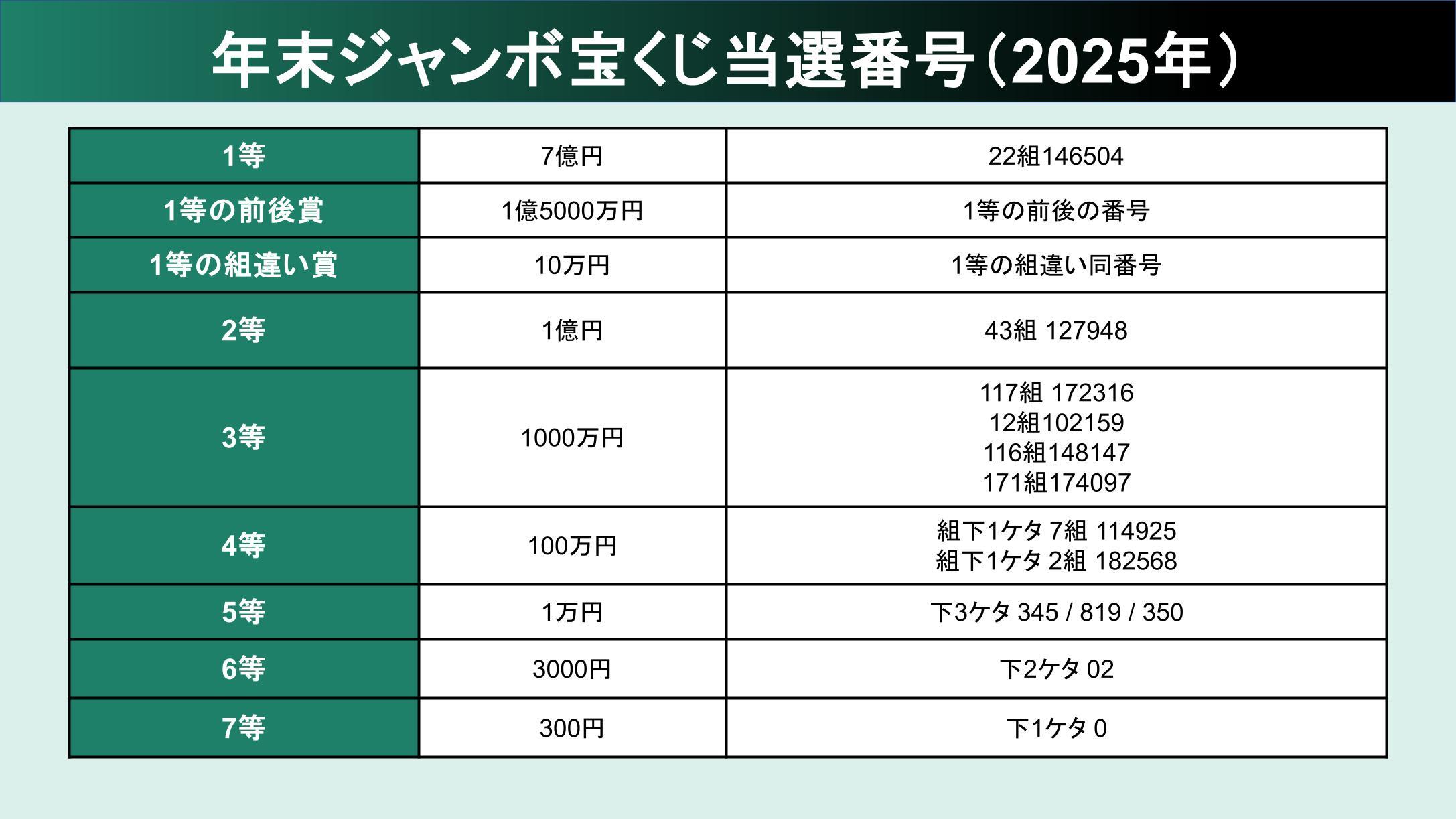 年末ジャンボ宝くじ(第1082回全国自治宝くじ)の当選番号が12月31日、決まった。 当選金の支払い期間は 2026年1月8日から1年間 。 当選番号は以下の通り。 ※各番号は発表されたら入れます ■1等(7億円)=22組146504 ■1等の前後賞(1億5000万円)=1等の前後の番号 ■1等の組違い賞(10万円)=1等の組違い同番号 ■2等(1億円)=43組127948 ■3等(1000万円)=117組 172316 / 12組102159/ 116組148147 / 171組174097 ■4等(100万円)=組下1ケタ 7組 114925 / 組下1ケタ 2組 182568 ■5等(1万円)=下3ケタ 345 / 819 / 350 ■6等(3000円)=下2ケタ 02 ■7等(300円)=下1ケタ 0 【画像】 一覧表で見る Related... 【年末ジャンボ宝くじ】当選番号のくじを当てた人の裏話「買ったのをすっかり忘れて...」【過去の7億円当選者】 年末ジャンボ宝くじ2025、当選番号の発表時間はいつ?抽選会はテレビやネットで見られる? ...クリックして全文を読む