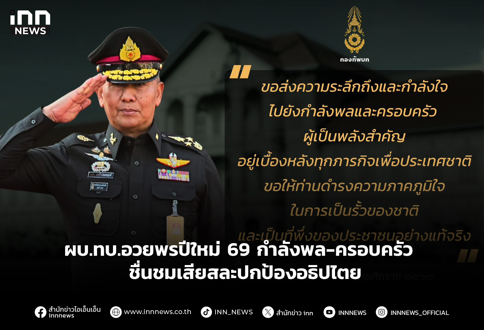 พลเอกพนา แคล้วปลอดทุกข์ ผู้บัญชาการทหารบก ส่งสารอวยพรปีใหม่ 2569 ถึงกำลังพลและครอบครัว ขอชื่นชมและขอบคุณกำลังพลทุกนายที่เสียสละ ทุ่มเท ปกป้องอธิปไตยของชาติ ทำให้ภารกิจสำเร็จลุล่วงไปได้อย่างมีประสิทธิภาพ