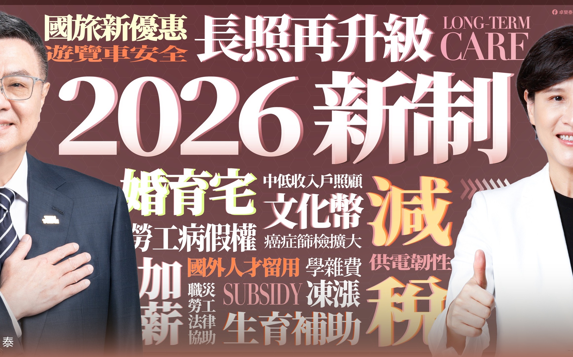 Newtalk新聞 今天(12/31)是2025年的最後一天,行政院長卓榮泰稍早在臉書發文宣布明年即將上路的新制,邀請大家一起分享、廣傳,強調2026年將「以人為本、溫暖施政」為主軸,致力打造全民好生活。但卓榮泰也感嘆,立法院至今仍未通過2026年度的中央政府總預算,部分新制將無法執行。「我期盼新的一年,人民可以看見行政立法的合作,創造一個人民被照顧、國家利益優先、充滿希望的新政局」。 根據行政院規劃,明年將有育嬰留停可以「日」為單位申請、婚育宅加碼租金補貼、基本工資調漲至29500元及時薪196元、中低收入戶生活補助提高、減稅、生育給付補足到10萬元,以及國旅補助、文化幣、長照3.0、擴大癌篩等措施。但由於總預算目前在立院仍未付委審查,育嬰留停彈性化、生育給付等政策都會因經費問題受影響,還有TPASS通勤月票、藥物韌性整備等。 卓榮泰指出,期盼新的一年,人民可以看見行政立法的合作,創造一個人民被照顧、國家利益優先、充滿希望的新政局,「祝福台灣越來越好,祝福大家新年快樂」。 延伸閱讀: 解放軍環台軍演 卓揆籲國人冷靜:政府已有萬全因應 卓榮泰:明年文化幣擴大發放 13-22歲全面領取1,200點 中央總預算卡關 羅智強:三把鑰匙握在賴總統手裡 卓揆:確保台灣空域和海域安全 否則中國必將成為國際公敵 總預算卡關重傷國防能量 賴瑞隆點名柯志恩表態支持速審
