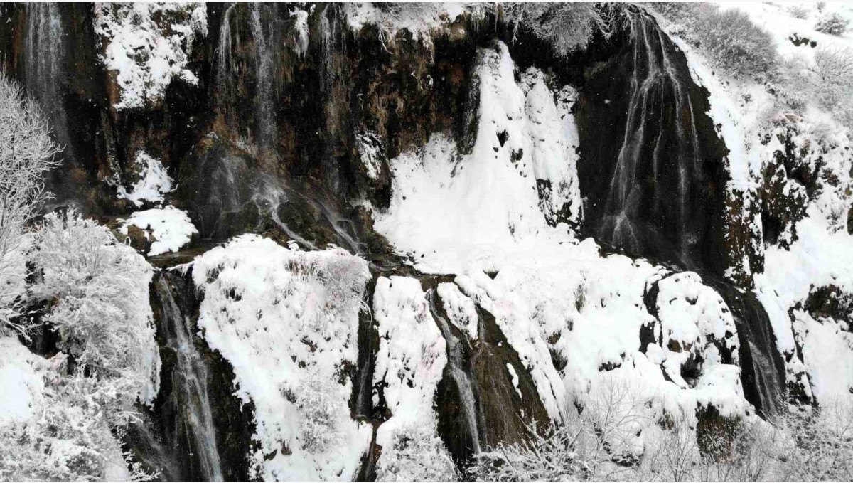 Erzincan'da doğal güzelliğiyle öne çıkan Girlevik Şelalesi, etkili olan kar yağışının ardından beyaza bürünerek kartpostallık görüntüler oluşturdu.