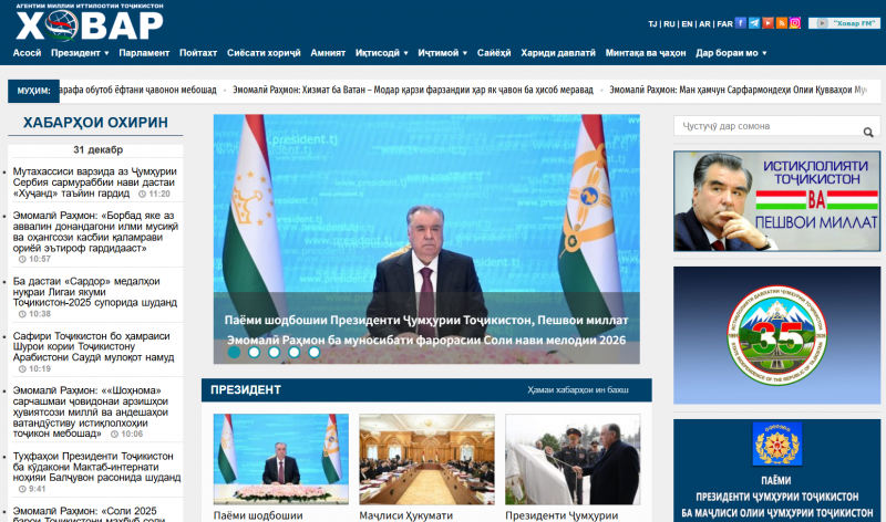 ДУШАНБЕ, 31.12.2025 /АМИТ «Ховар»/. Имрӯз ба таъсиси Агентии миллии иттилоотии Тоҷикистон «Ховар» 100 сол пур мешавад.  АМИТ «Ховар» 31  декабри  соли  1925 дар заминаи  шуъбаи  ТАСС  дар  Тоҷикистон таъсис  ёфта