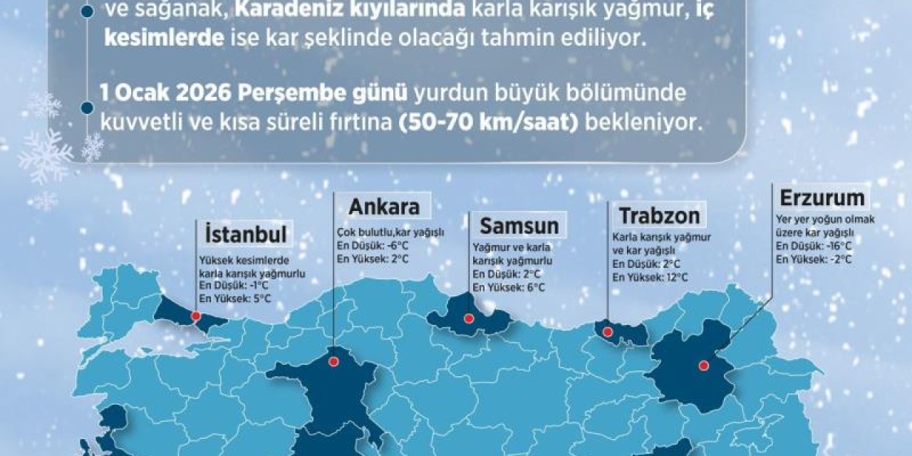Meteoroloji Genel Müdürlüğü, yeni yıl için hava tahminlerini açıkladı. Yeni yılın ilk gününde Türkiye genelinde soğuk ve yağışlı hava etkili olacak, iç kesimlerde ise kar yağışı bekleniyor.