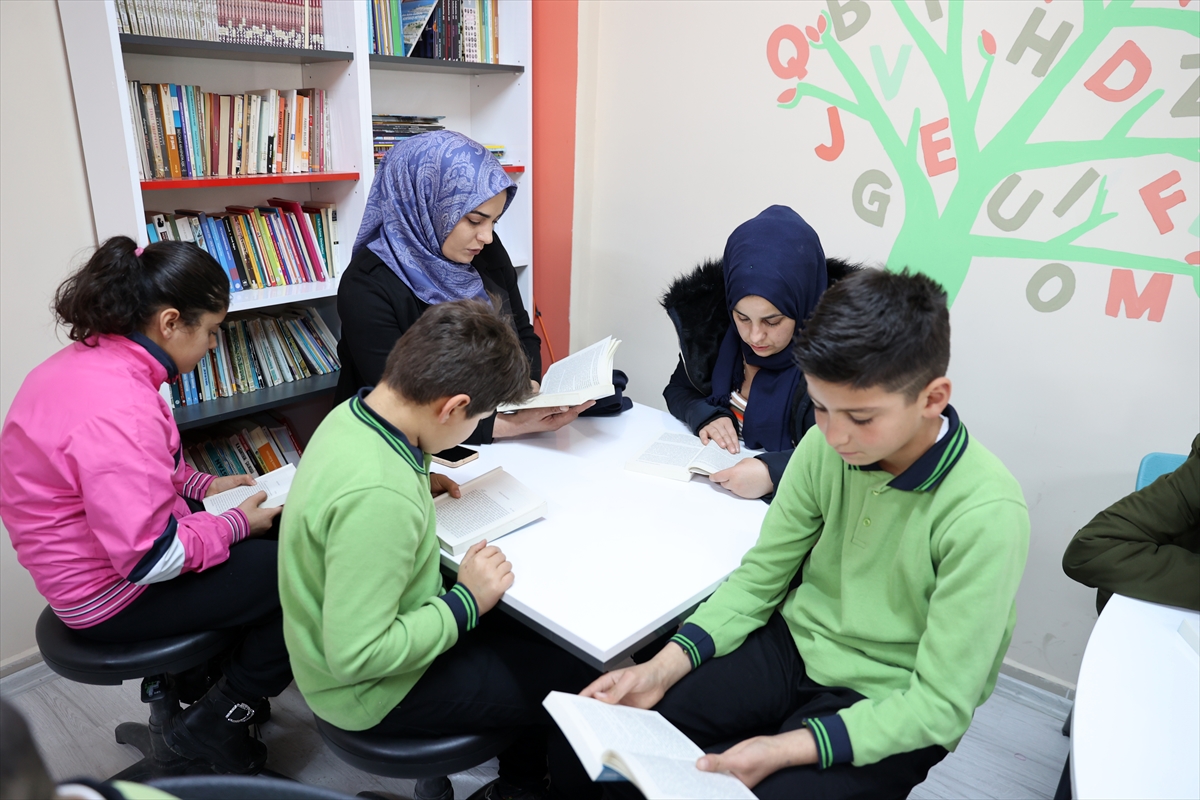 Sivas'ın Ulaş ilçesine bağlı Baharözü köyündeki ortaokulda başlatılan proje ile öğrenciler ve velileri, okulun kütüphanesinde bir araya gelerek kitap okuyor.