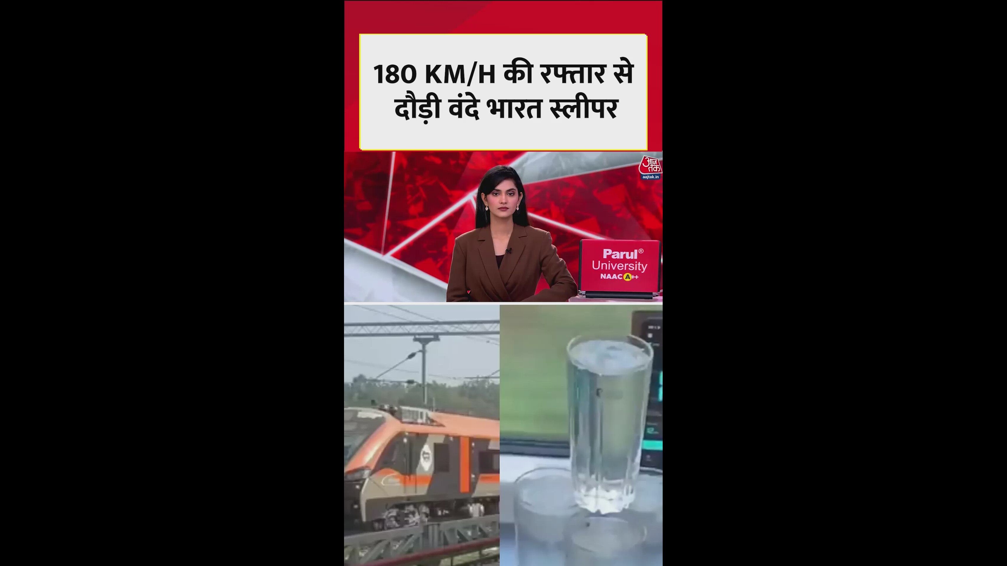 भारतीय रेलवे ने वंदे भारत स्लीपर ट्रेन की स्पीड का परीक्षण किया है। इस दौरान ट्रेन कोटा नागदा सेक्शन पर एक सौ अस्सी किलोमीटर प्रति घंटे की रफ्तार से दौड़ाते हुए देखा गया। इसके साथ ही पानी से भरे ग्लास के ऊपर ग्लास रखकर वाटर टेस्ट भी किया गया जिसमें पानी की एक बूंद तक हिलने नहीं पाई।