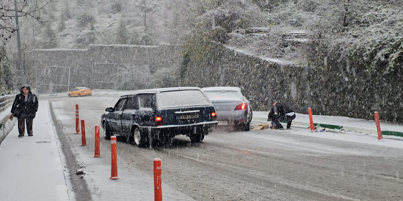 Zonguldak'ta sabah saatlerinde kar yağışı etkili oldu. Zonguldak Bülent Ecevit Üniversitesi (BEUN) Hastanesi yolunda kar lastiği kullanmayan sürücüler yolda kalınca trafik durdu.