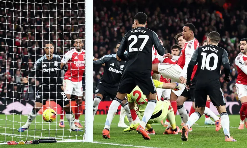 LONDON: Arsenal closed out 2025 in emphatic fashion, smashing third-placed Aston Villa 4-1 on Tuesday to surge five points clear at the top of the Premier League. Manchester United were held to a 1-1 draw by bottom side Wolverhampton Wanderers, who collected their third point of the season, while Bournemouth grabbed a point at stuttering Chelsea, forcing a 2-2 draw after a frantic first-half display. Man United are sixth, level on 30 points with fifth-placed Chelsea. At the Emirates Stadium, Arsenal slammed the door shut on charging Villa, ending their club-record winning run of 11 games. Goals by Gabriel Magalhaes and Martin Zubimendi early in the second half gave Arsenal control of a game that had looked fraught with danger. Gabriel bundled in the opener from a corner in the 48th minute before Martin Odegaard slid a pass through for Zubimendi to score four minutes later. Arsenal secured the points when Leandro Trossard fired home from the edge of the area before Gabriel Jesus came off the bench to add the fourth. Ollie Watkins grabbed a consolation goal for Villa in stoppage time. “I think it was amazing,” Jesus told Sky Sports. “It’s always hard to play against them… The mentality of the team is really, really growing and each game is growing even more and I think we are winning today because of the mentality.” Arsenal top the standings with 45 points, while second-placed Manchester City can close the gap when they play at Sunderland on Thursday. Egypt’s Sobhi sentenced to a year in prison in academic fraud case, media reports Villa are six points adrift of Arsenal. It took six minutes at Stamford Bridge for Bournemouth to shock Chelsea when David Brooks grabbed the opener. Cole Palmer equalised from the spot in the 15th minute and Fernandez put Chelsea ahead with a bullet shot eight minutes later. Justin Kluivert brought Bournemouth back level in the 27th, to grab a point, adding to the London side’s unenviable record of one win in seven league games. Chelsea sit fifth, while Bournemouth are 10 spots below them. MAN UTD struggle Manchester United striker Joshua Zirkzee made the most of a rare start by giving the depleted hosts the lead with a deflected shot from the edge of the box in the 27th minute. But Wolves managed to level just before the break thanks to a header from Ladislav Krejci. Patrick Dorgu briefly celebrated what he thought was a 90th-minute winner, but it was chalked off for offside. “We struggled in all the game,” United boss Ruben Amorim said. “We had a lack of creation… the fluidity offensively wasn’t there. “We didn’t play well. When you don’t play well with the ball, you struggle without it.” Wolves have three points from 19 games, 15 points from the safety zone. Newcastle United’s Joelinton scored after 65 seconds and Yoane Wissa doubled their lead five minutes later in a 3-1 thrashing of 19th-placed Burnley, who are winless in their last 10 games. Josh Laurent pulled one back in the 23rd minute, but Bruno Guimaraes sealed Newcastle’s rare away win with a goal in stoppage time. Everton climbed to eighth in the standings with a 2-0 win over their former manager Sean Dyche and Nottingham Forest thanks to goals from James Garner and Thierno Barry. West Ham United drew 2-2 with Brighton & Hove Albion in a game that featured three penalties in the first half. Jarrod Bowen and Lucas Paqueta, from the penalty spot, scored before the break for West Ham, while Brighton’s Danny Welbeck struck from the penalty spot in the 32nd minute but fired another off the crossbar. Joel Veltman scored for Brighton in the 61st minute to secure the draw. There are four more games on New Year’s Day, including fourth-placed Liverpool hosting Leeds United at Anfield.