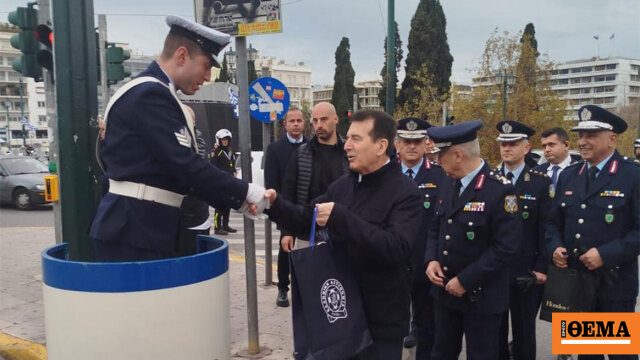 Ο Χρυσοχοΐδης αντάλλαξε ευχές και έδωσε δώρα στον τροχονόμο στο βαρέλι στην πλατεία Συντάγματος