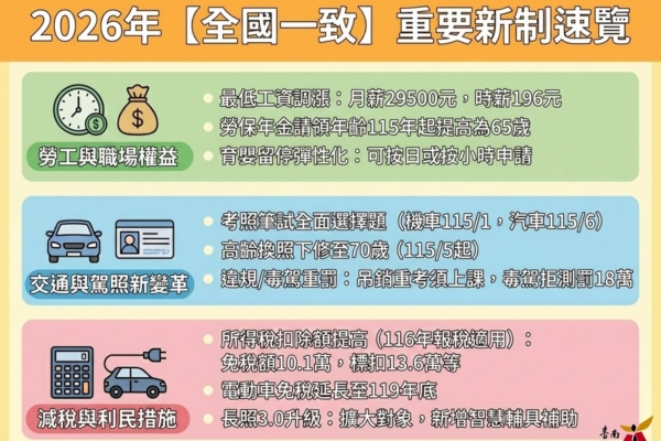 2026年全国一致重要新制的速览图。(南市府提供)
