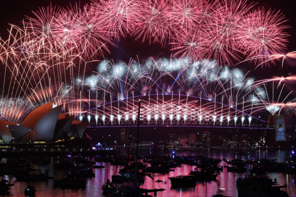 2026年1月1日,新年钟声响起时,姹紫嫣红的烟花照亮悉尼海港。(Izhar Khan/Getty Images)